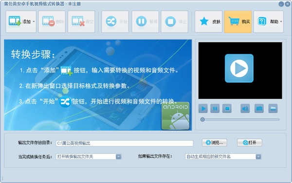 蒲公英安卓手机视频格式转换器对准的作用领域是广大安卓系统的手机,目的是把手机中存储的任意视频格式进行互相转换,其中就包括MP4、WMV、FLV等常用的视频格式,该工具的优势和家族转换工具一致,都在界面上设置了引导教程,并在处理过程中可以查看实时转换的画面效果以及进度,记得提前安排好本地的路径。