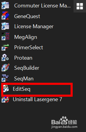 2、选择EditSeq这个程序,此程序的功能是分析GC含量、查找某个位置的碱基、碱基校对、DNA序列翻译为氨基酸序列、序列反向互补、序列反向等等。