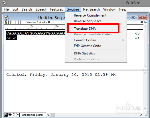 6、返回第4步,在DNA statistics 上面可以看到Translate DNA,点击之后再弹出的窗口中可以看到翻译后的氨基酸序列。