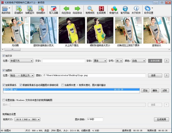 七彩色电子相册制作工具可支持本地存储的各类视频动画图像文件素材的导入,并预置了多类型的相册主题供用户自己去选择使用,此外还可在相册的制作过程中增加符合条件的背景音乐来渲染提升整个相册的主旨,为视频图像内容增加个性化的水印以提升辨识度,自然也可保护自己相册的版权,注意设置好前后图像切换的停顿时间以过渡更加自然。