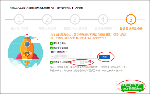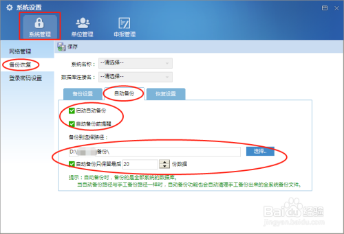 1.第一种方法是在系统注册的第五步,这一步可以设置启动自动备份、自动备份前提醒、备份路径、自动备份保留份数。启动自动备份系统默认是勾选的,另外我们建议手工勾选自动备份前提醒,这样会在每次退出系统时提示我们进行备份,我们可以选择是或否。自动备份保留份数系统默认为10份,我们可以根据电脑性能自行决定保留的份数;