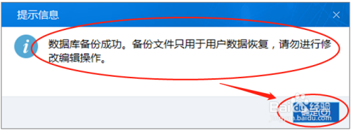 6.如果我们选择是,则提示数据库备份成功。备份文件只用于用户数据恢复,请勿进行修改编辑操作。点击确定;