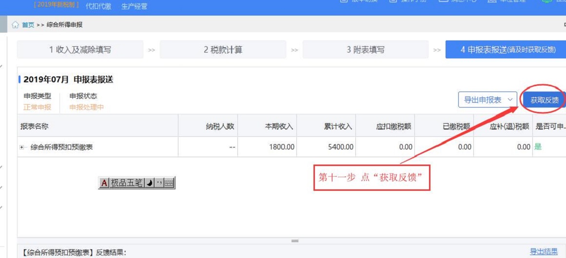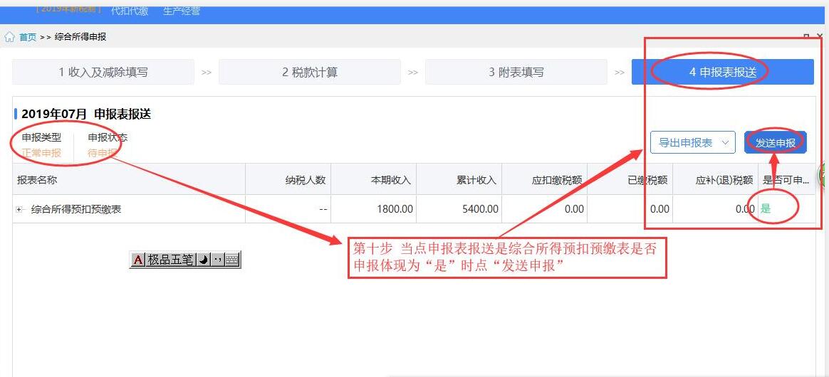 第十步 当点申报表报送且综合所得预扣预缴表所在行末端是否可以进行申报体现 为是时点申报表报送。