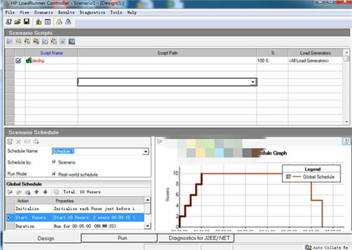 1、Virtual users 建立起后,您需要设定您的负载方案,业务流程组合和虚拟用户数量。用该软件的Controller,您能很快组织起多用户的测试方案。Controller 的Rendezvous 功能提供一个互动的环境,在其中您既能建立起持续且循环的负载,又能管理和驱动负载测试方案。