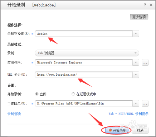 5、选择录制脚本的位置以及网址后,点击【开始录制】