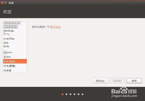 也可一直等待,等到它自己跳出安装界面后自己从左边的选项里选择中文,选择安装(也可选择使用ubuntu 进入使用界面),安装教程跳到第 11步