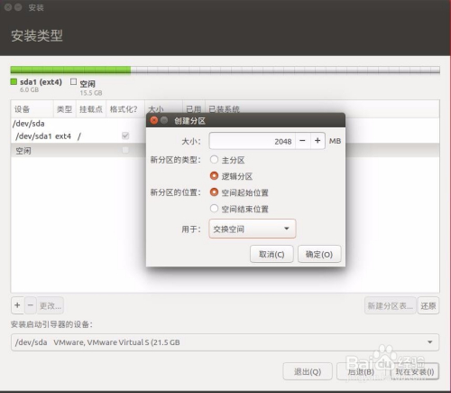 Swap(相当于电脑内存):逻辑分区、大小设置为电脑内存大小,2G,4G;