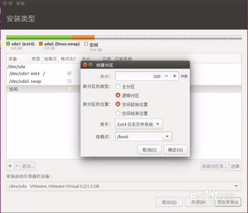 /.(主分区):主分区,用于存放系统,相当于win7的C盘,10G即可。