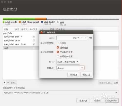 /home(用户存储数据用):逻辑分区,要尽可能大,100G空间可以设置为85G,留10G给主分区即可。