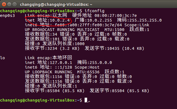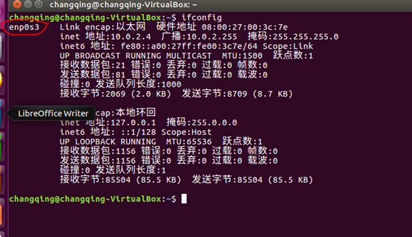 输入ifconfig命令查看网卡信息,下图红圈处就是网卡名称。