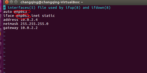 修改内容如下:下面的enp0s3需要改成自己的网卡名称,就是上面第一步的红圈信息。ip地址,掩码网关自己合理配置就行了。记得wq!保存退出。