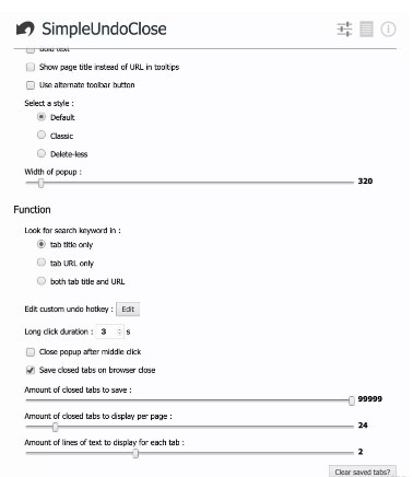默认只显示 10 个刚刚关闭的标签页,但是,你可以在 SimpleUndoClose 的设置中将 Amount of closed tabs to save 的数量修改为需要的数量,最大 99999,基本上无敌了。