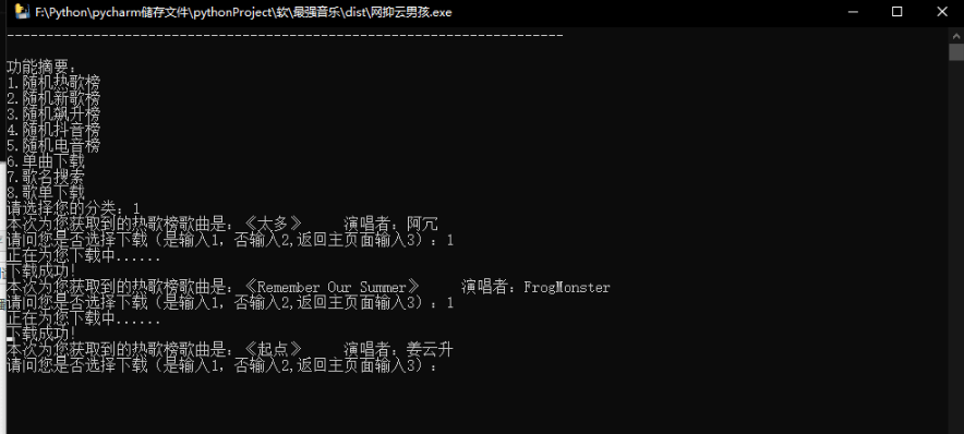 网抑云孩没有UI界面,但是功能非常易于使用,可以帮助音乐发烧友获取随机热歌榜、新歌榜、飙升榜、抖音榜、电音榜内容,并支持单曲下载、歌名搜索、歌单下载,下载速度较快,而且连会员特权的歌曲也能够下载。