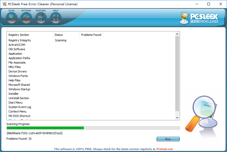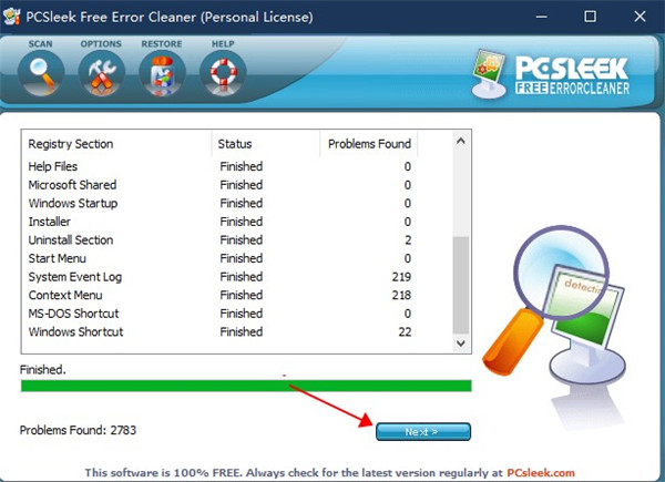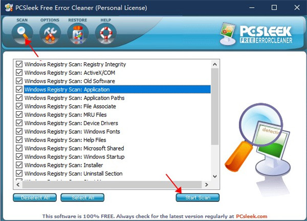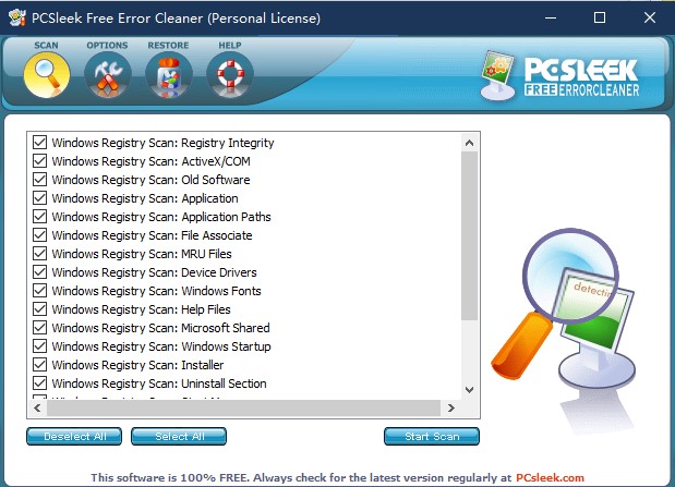 注册表在电脑内部相当于各种应用安装使用的身份证明,自然在多次反复的传输过程中容易出现损坏的问题,而这款PCSleek Free Error Cleaner可在启动后自动完成对于电脑本地所有存储注册表信息的快速检测,查找这些文件的完整性以及损坏的严重程度,随机根据问题的具体情况来完成批量注册表信息的恢复。