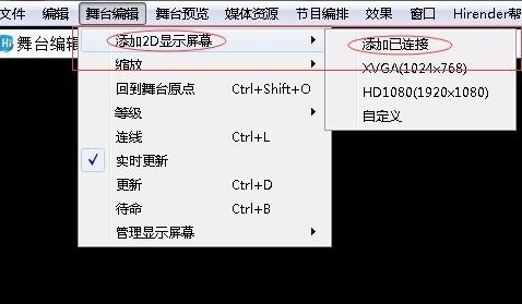点击:舞台编辑-添加2D显示屏幕-添加已经连接