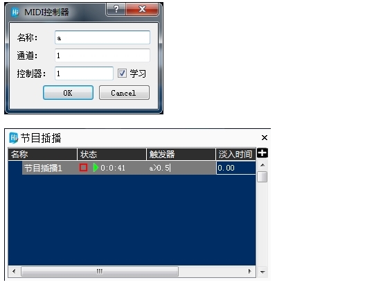 添加好MIDI控制器后,点击节目插播列表的触发器填写框,输入含有控制器旋钮名称的触发条件