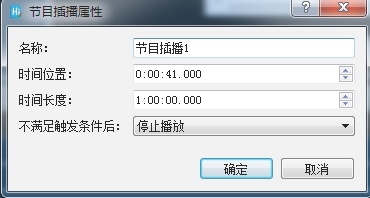 在此界面,可以更改节目插播的名称,时间线长度,并且可以改变不满足触发条件后的选项来设置当触发器的条件不满足后,该节目插播是暂停播放、继续播放还是停止播放。