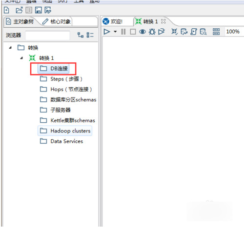 新建转换后在左边的主对象树中建立DB连接用以连接数据库。如图所示:
