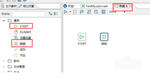 使用作业可以定时或周期性的执行转换,新建一个作业。并从左边面板拖入start 和转换。