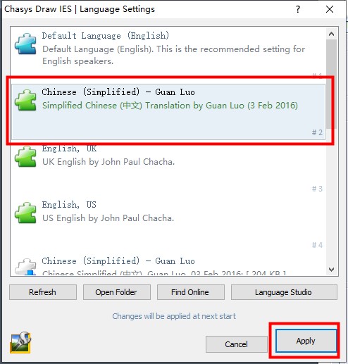 3、在语言设置中找到中文Chinese,点击apply(应用)。