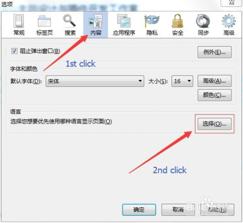 打开选项后,选择对话框上首的内容,再点选语言设置项的选择。