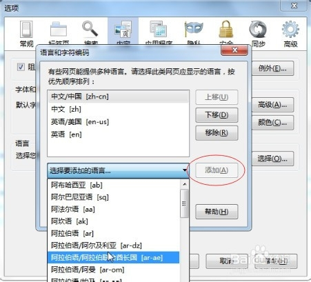打开选择对话框后,可以选择设置已经安装的语言为首选语言,如果没有安装,可在选择要添加的语言下拉选项中选中你要添加的语种,并且点击右侧添加按钮,然后确定。