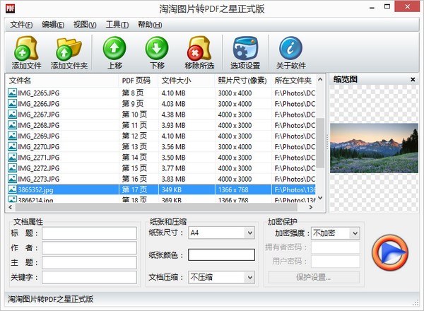 淘淘图片转PDF之星这款工具在首页上设置了引导新入手用户的教程,可支持把扫描的书籍照片或者各类图像格式转换成PDF格式文件,另外在工具的下方有着文档属性、纸张和压缩以及加密保护三大参数设置项目,根据步骤一步步走就能很快上手,整个过程中最大化保留转换后的页面布局以及内容完整性。
