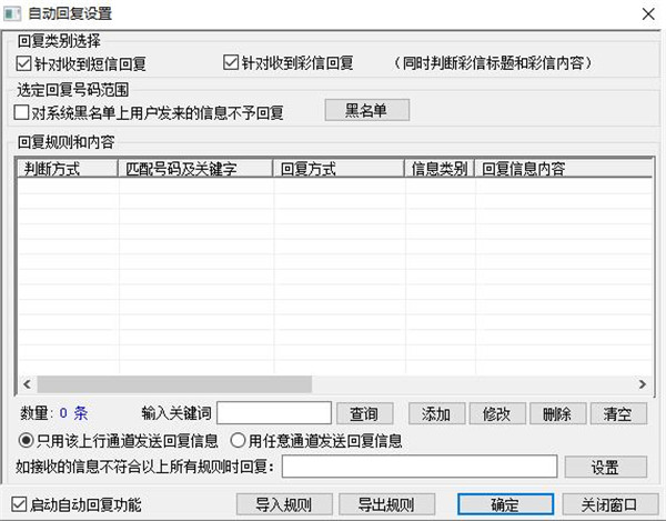 8、自动回复:设定各种短信、彩信的自动回复规则,实现短信、彩信的自动回复;