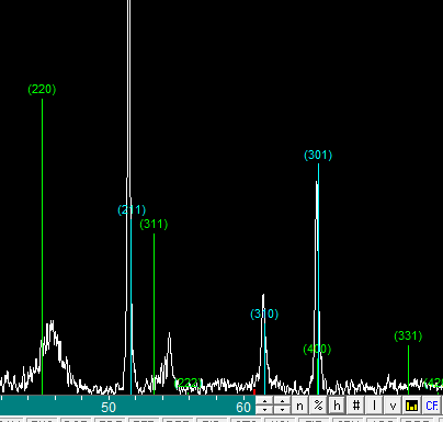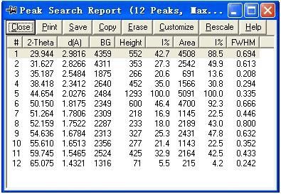 在此窗口中显示了以上操作中所确定的峰位置、强度、半峰宽(FWHM)等参数,其中FWHM将时计算晶粒度的主要参数。