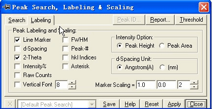 选择analyze/find peaks,在此窗口中选择Labeling标签,可以选择峰的标示方式,如下图: