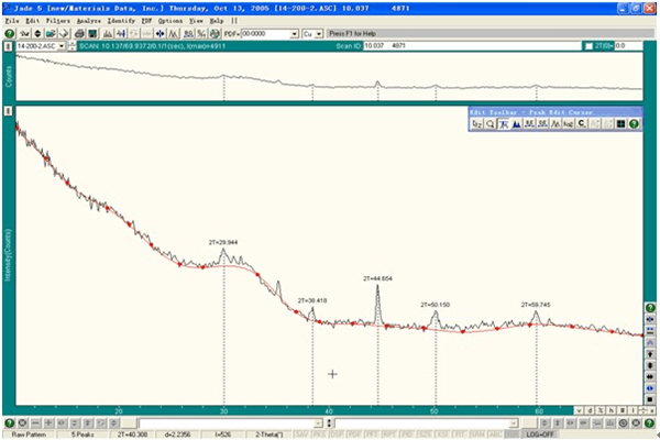 在主菜单中选择analyze/Theta Calibration,在出现的窗口中选择标定数据的方式;在Options中选择要进行的定量分析,如晶面指数、晶粒度、晶胞参数等方面的计算,其具体步骤可参阅软件自带的帮助文件jade5.chm。