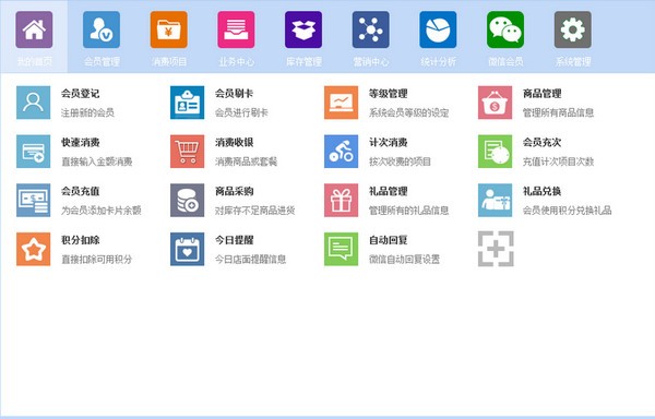 多讯会员管理系统采把所有的功能项都采用图表化的样式进行独立集成,比较像工具箱的设计,不过该有的功能都非常齐备,用户可把本地的会员数据都统一导入,同时完成后续会员的信息登记以及消费数据的统计等,可根据自己的需求把导航栏内的功能项拖拽处理,确保都是本单位会员管理中会使用到的功能。