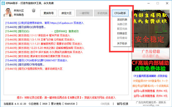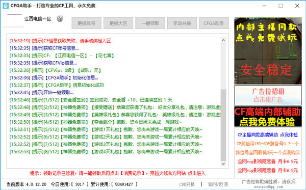 CFGA助手起到的主体作用是把用户所在这款FPS射击游戏大区的所有渠道游戏礼包进行一站式的完整领取,用户在登录自己的游戏账号后就能在界面上实时查看领取礼包的日志,可选一键兑换或者手动领取,另外这款工具也能在线查看自己账号的具体信息,包括军衔等级、物品库存以及战绩等信息。