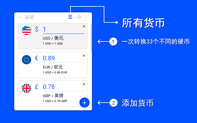 下面说到货币转换器插件拥有33种货币汇率计较,点击弹窗顶部的【多转换器】操控键位,再点击右下角的“+”号加入不同货币便可。
