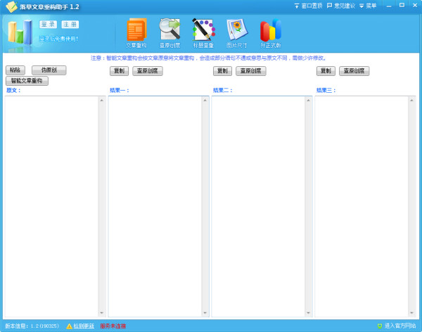 落草文章重构助手突出的优势在于自动检索出文章的问题,且可提供多个文本框区域来同步处置多段文本内容,是属于不可多得的查重重构工具,在检验毕业论文的重复率时候也十分好用,只需要用户获知出现问题的部分一键替换即可。