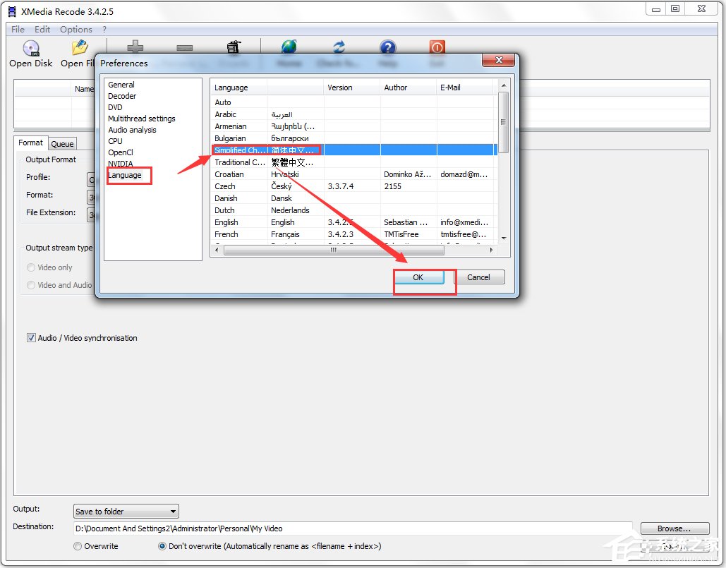 XMedia Recode为绿色中文版,解压翻开便可运用,非中文的可以开启中文设置:Options-》preferences-》languages:简体中文