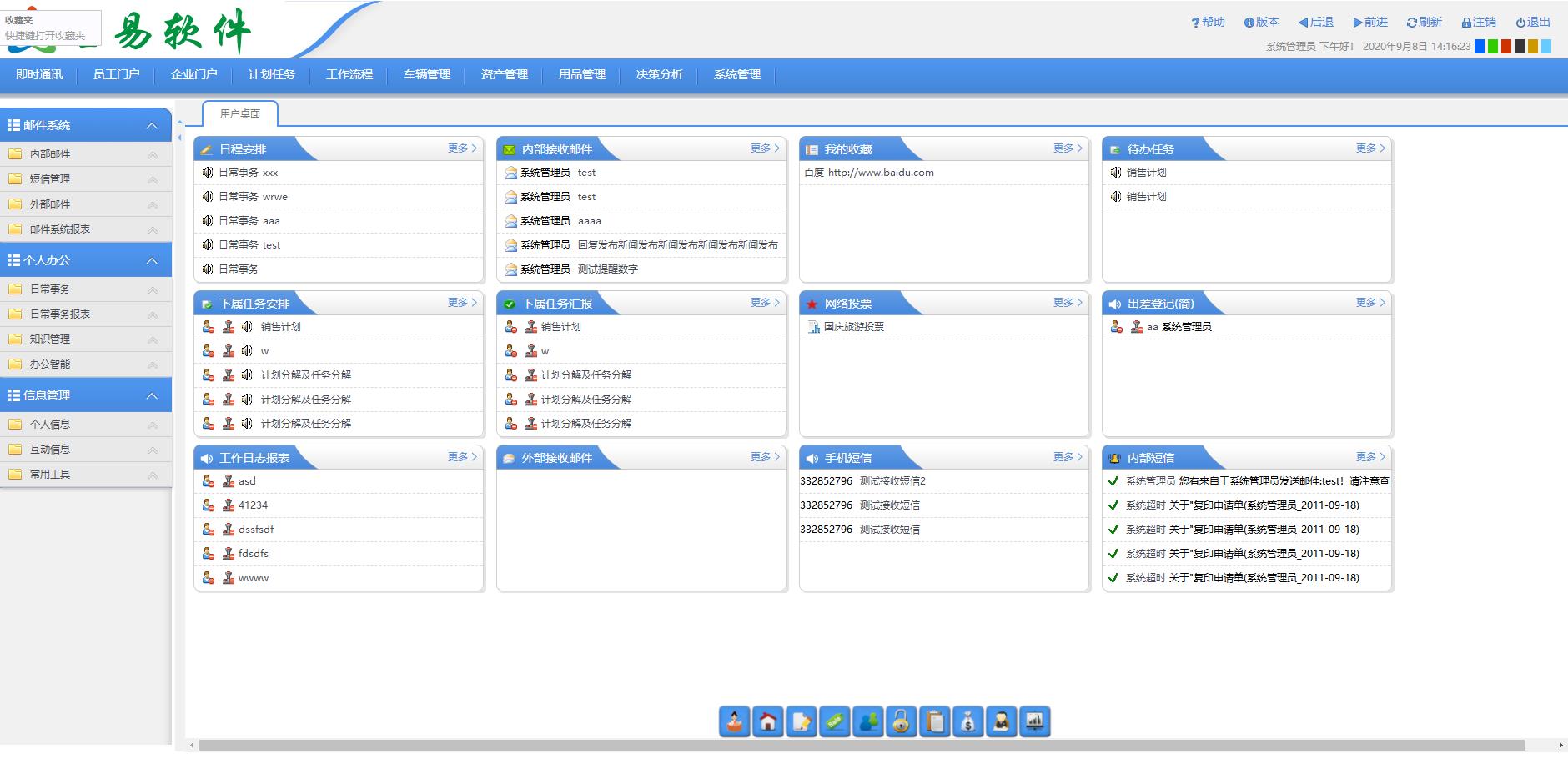 外部邮件,内部邮件,系统短信,手机短信, 打算办理,义务办理, 平常事务,常识办理,BBS论坛,收集投票,公共信息,私人办理,公司办理,任务流程,资产办理,用品办理,车辆办理,集会办理,图书办理,实时语音链接,智妙手机开辟平台,开辟平台,微信开辟平台,微信企业号,系统设置,权限办理,平安办理,信息库办理等。