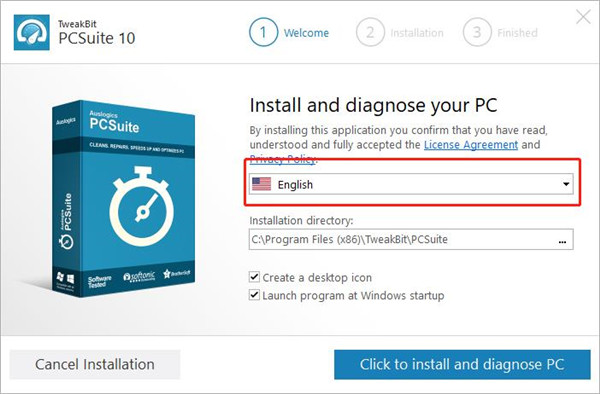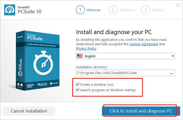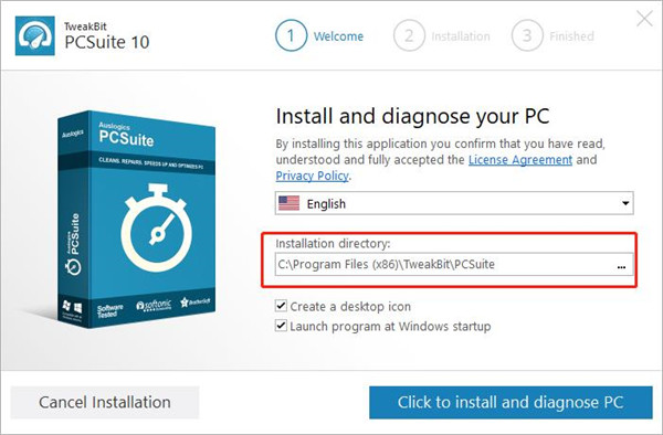 2、点击。。。可更改装载软件定位装载导游默许设置的软件默许装载途径为C:⁄Program Files (x86)⁄TweakBit⁄PCSuite。