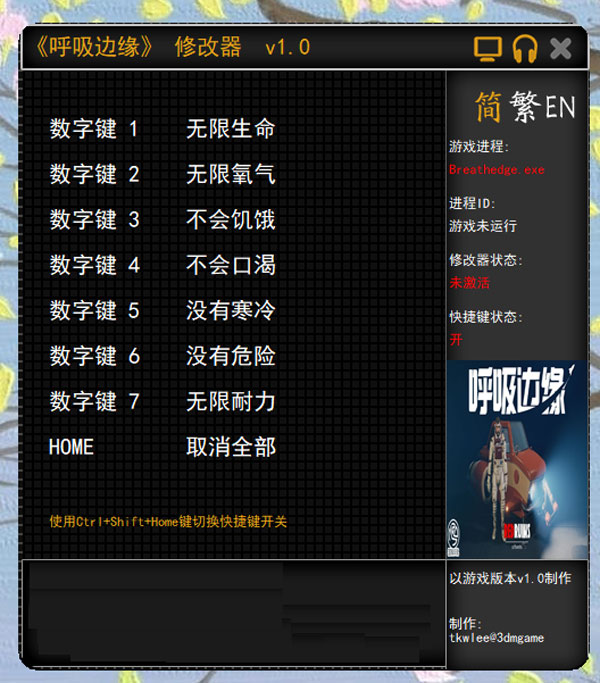 呼吸边缘七项游戏器是论坛玩家针对该款太空生存冒险类游戏推出的参数改动类软件,改动的地方自然只是对玩家所持角色独立生效,并且都具有自己独立的快捷按键,包括在太空中人物角色的生命数目以及氧气等资源的限制去除等内容,可以说让游戏的可玩性程度上了一个台阶,没有太多的桎梏所在。