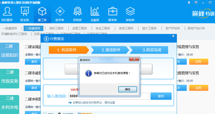 巅峰特训云题库免激活不需要您购买注册码,启动软件后,选择感兴趣的课程,在激活页面随便填几个数字就能够使用所有课程。该软件的课程类型涵盖了财会类、建工类、医学类、资格类、金融类、国考类及其他类型。