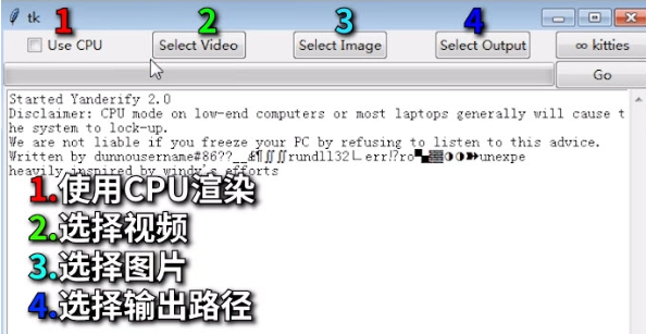 Yanderify(让图片开口唱歌的软件)的操作过程相对比较简单,不需要用户手动制作视频特效,需要上传五官清晰而且角度相似的图片与MP4视频,调整为统一的分辨率,然后可以使用CPU渲染,执行生成任务。