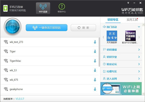 wifi万能钥匙让普罗大众的无线网络使用带来了更大的便利程度,此次介绍的PC端版本,具体的功能项比较一致,且广告推广没有那么多,在页面中直接打开网卡检索出附近的无线网络热点,根据信号源的格数来选定最合适的网络源完成密码破除和连接,但是不要把的密码分享,保护隐私安全。