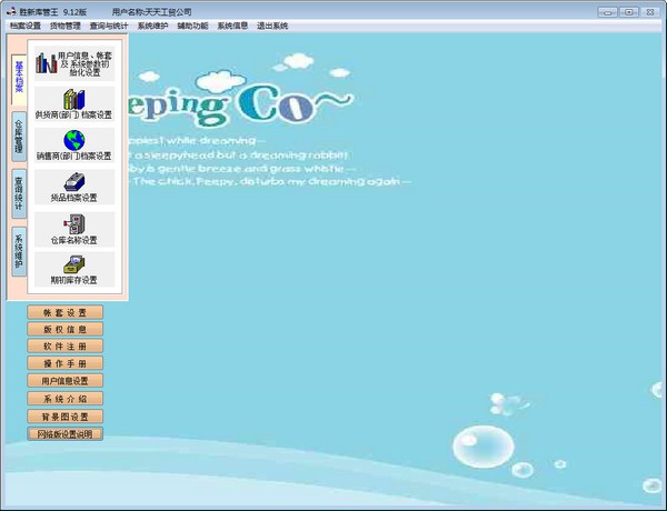 进入胜新库管王主场景布局以后,在档案设置一栏中可以看到用户信息、账套及系统各项参数设置等信息