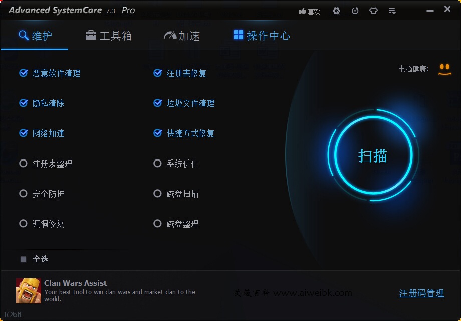 advanced systemcare pro对待电脑内部的各项数据信息清理有着明细的处理方案,已经做了正确规范,主体呈现黑蓝设计,在电脑后端一直启动就可以保持各项数据信息的常态化运行检验,及时呈现电脑的工作状态,以表情颜色和样式变化来针对性提醒,点击工具箱做定制化的维护处理。