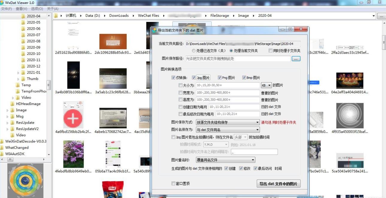此工具可以加载经过加密的dat文件,直接在文件夹中批量展示图片的缩略图,并支持设置过滤条件,按照大小、尺寸、文件创建或最后修改日期等进行筛选,快速找到需要的图片。它支持导出dat图片,并同时执行重命名操作。