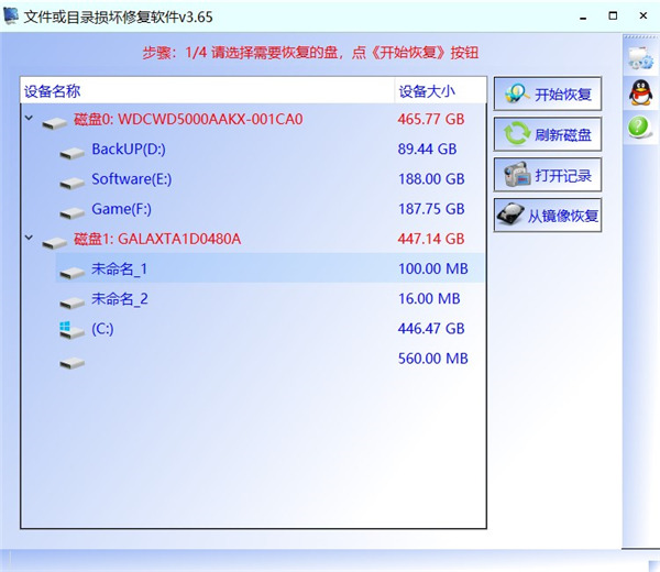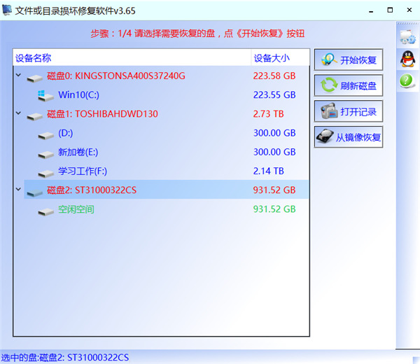 1、翻开文件或目次破坏修复软件后,选择需求恢复的盘,点《起头恢复》