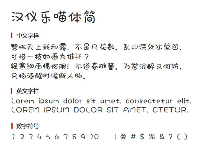 汉仪乐喵体简电脑版不再显得那么规矩,该字体的结构不再是工工整整的,结构更显随意。该字体能够用简单的线条表达出更为丰富的韵律,你可以通过该字体感受到孩子的天真与可爱,你能够在该字体中感受到字里行间的活泼与俏皮。