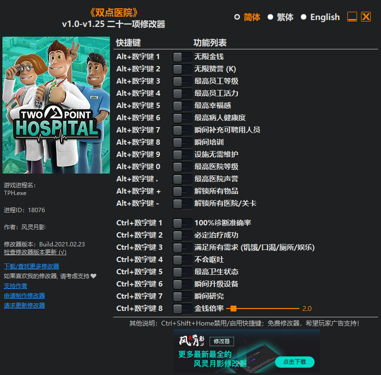 以上就是关于《双点医院》二十一项修改器风灵月影版的全部使用说明了,如果你还想要各种性能强大的相关游戏辅助软件就快快在游戏爱好者网站寻找吧!