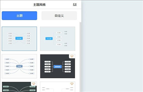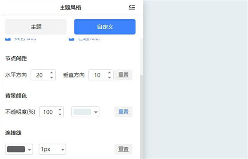 若是对软件自带的主题不对劲,可以在点击主题后选择自行设置,在自行设置主题方面,你可以自在设计节点的毗连线、节点间距、画布布景色彩、边框色彩、边框大小和圆角等。