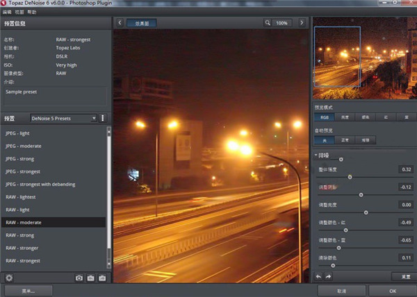 Topaz Denoise 6汉化版这个滤镜首要是用来消弭RGB图象中的噪点,它运用怪异的算法可以有用的去除大面积、各种各种不同类别的静态图片上的噪点保存图象细节和锋利度。